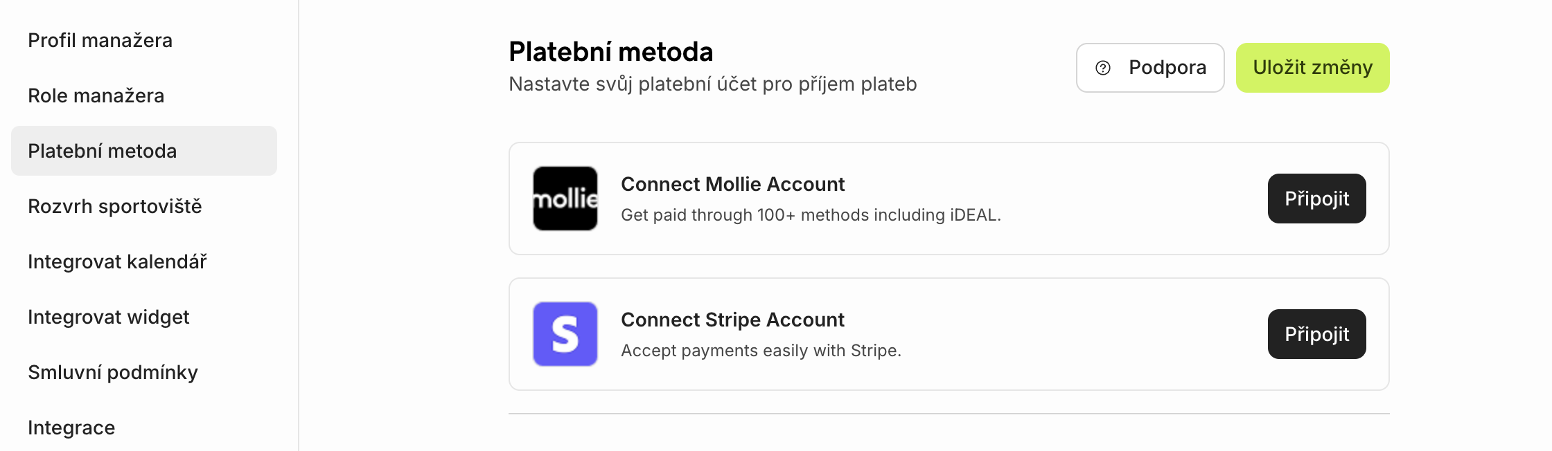 Důležité: Nastavení platební metody je nutné, než můžeš přijímat rezervace a než ti klienti můžou platit.