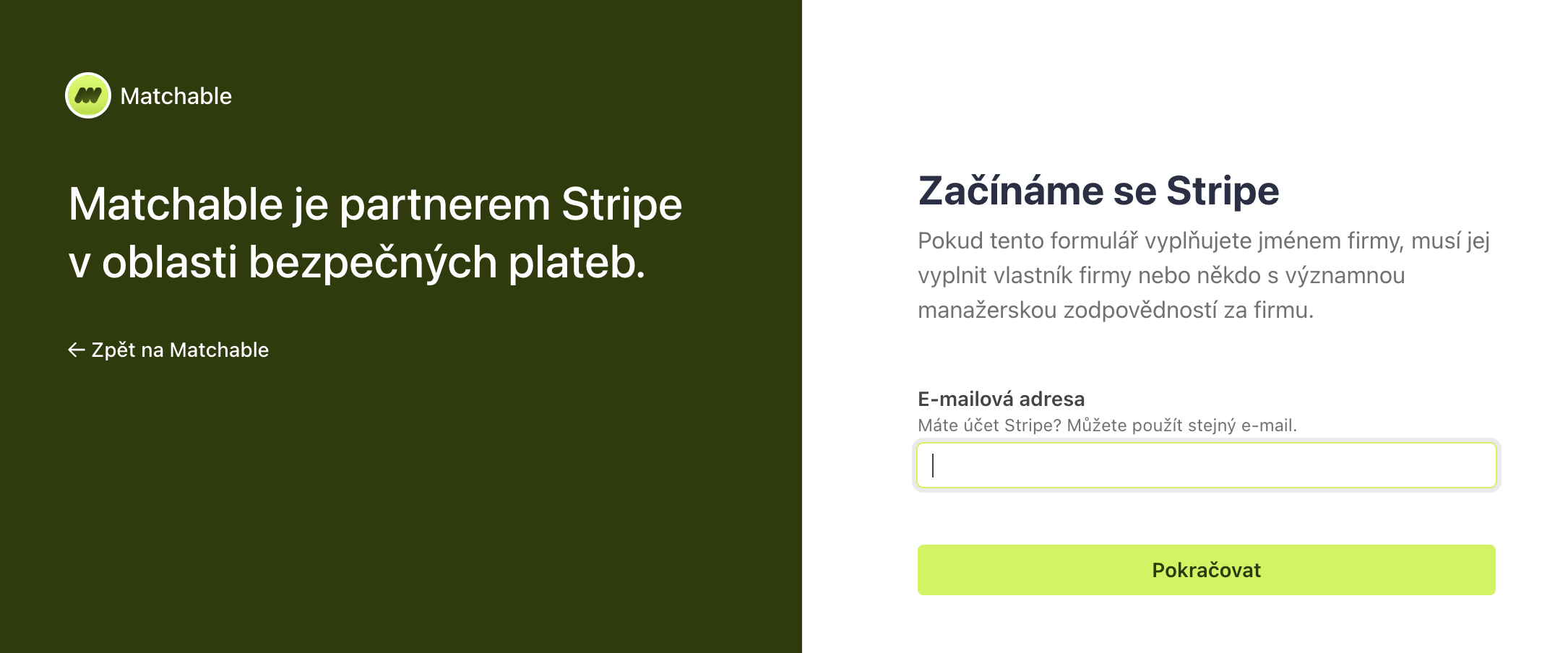 3. Po kliknutí na Připojit (např. Stripe účet) budete přesměrováni na onboarding stránku Stripe. Přihlaste se ke svému existujícímu účtu, nebo si vytvořte nový zadáním e-mailové adresy a hesla. Postupujte podle pokynů Stripe, abyste dokončili nastavení svého platebního účtu.