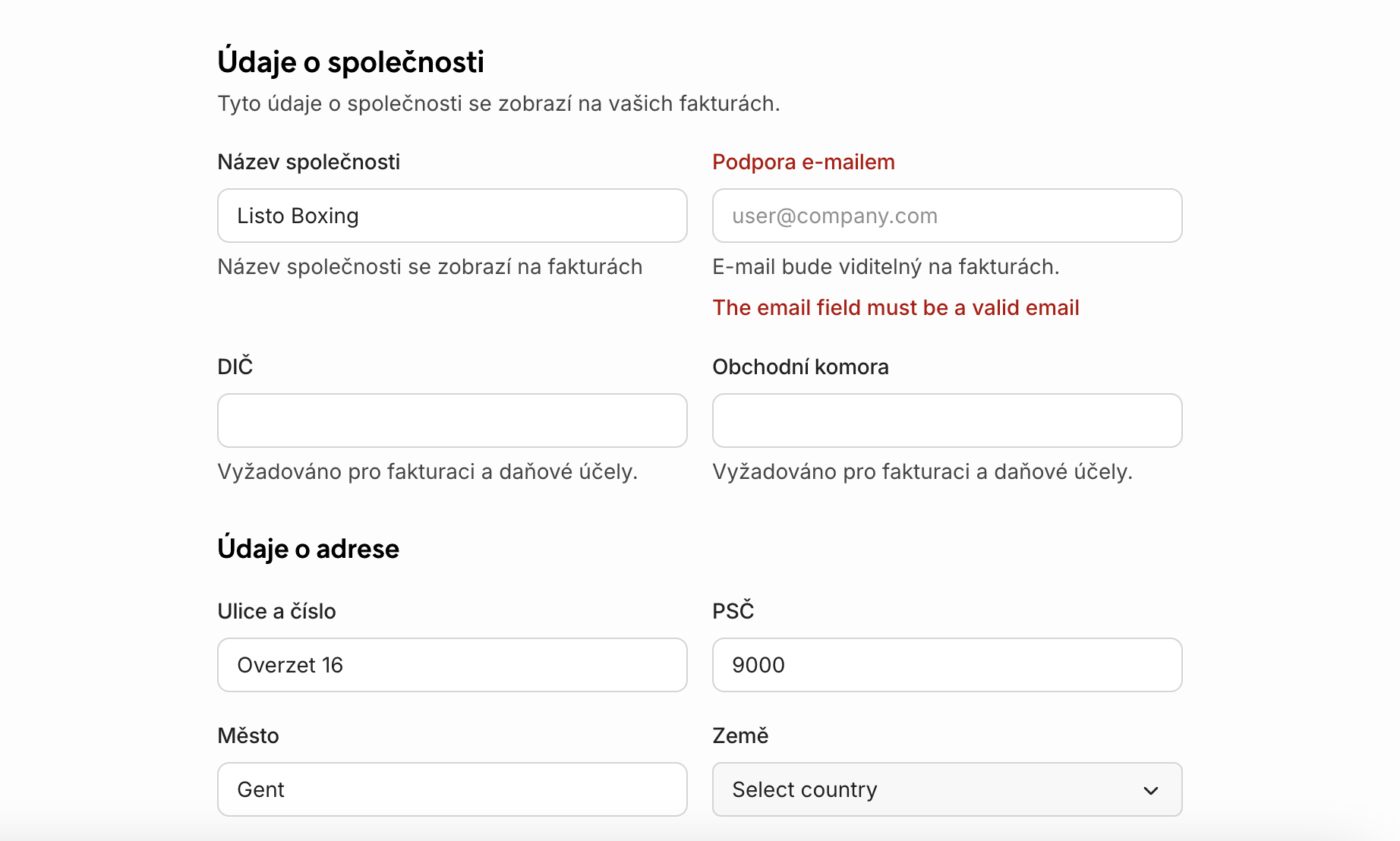 Vyplňte požadované údaje o společnosti, které se budou zobrazovat na vašich fakturách.