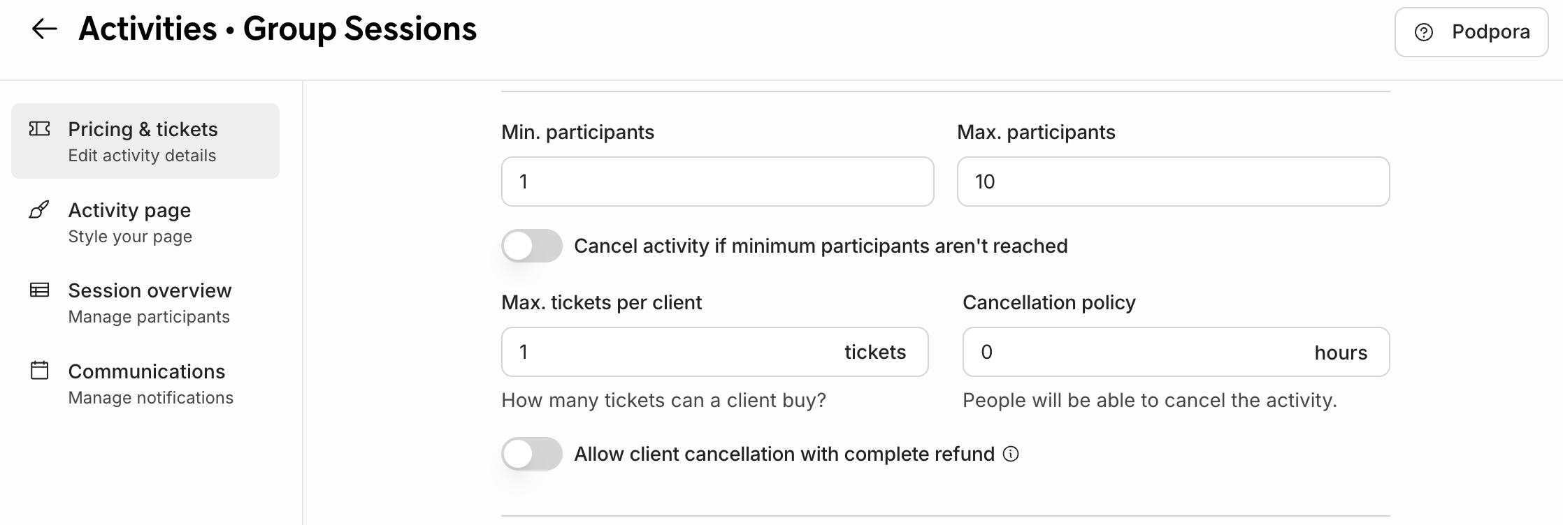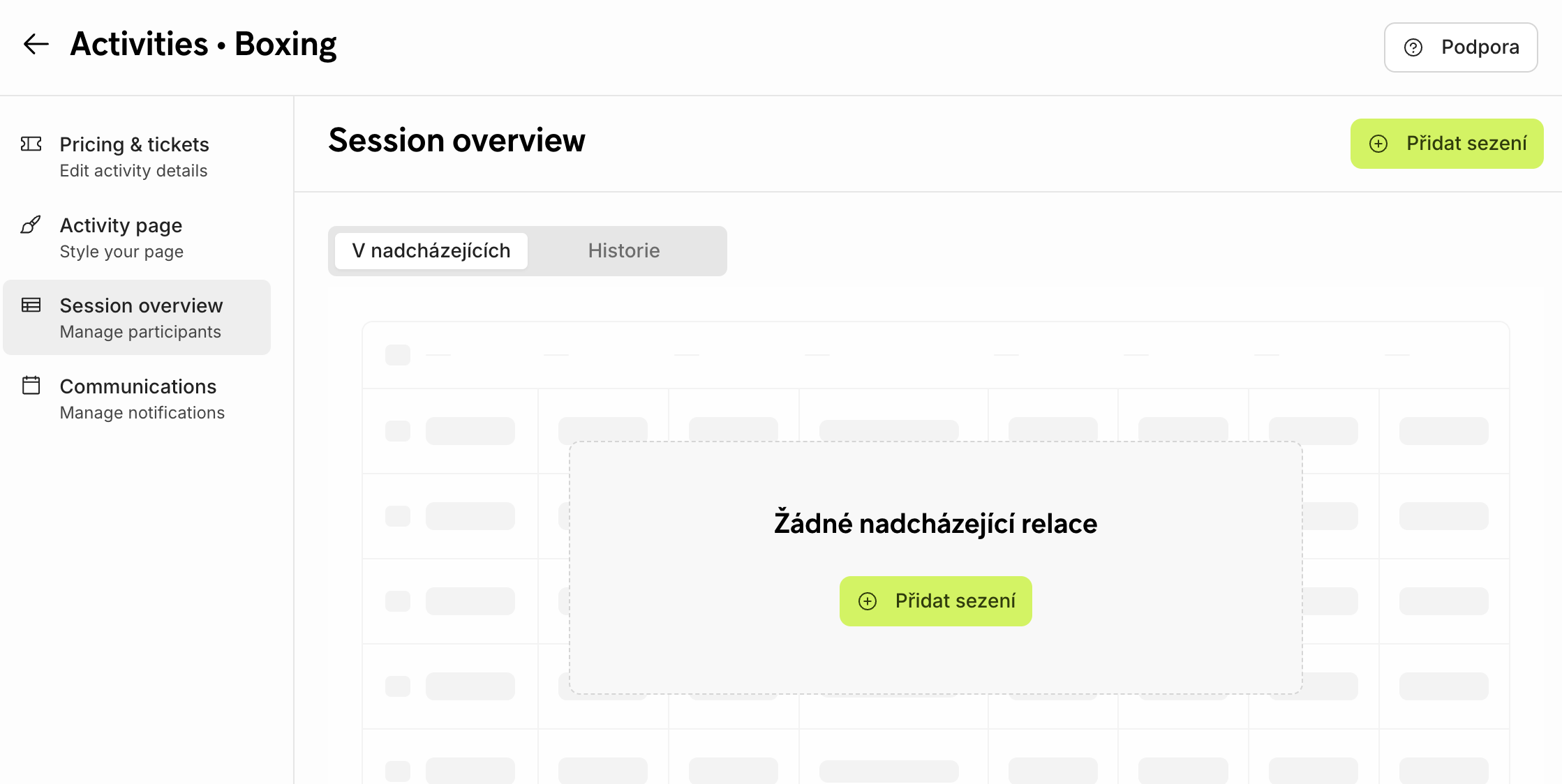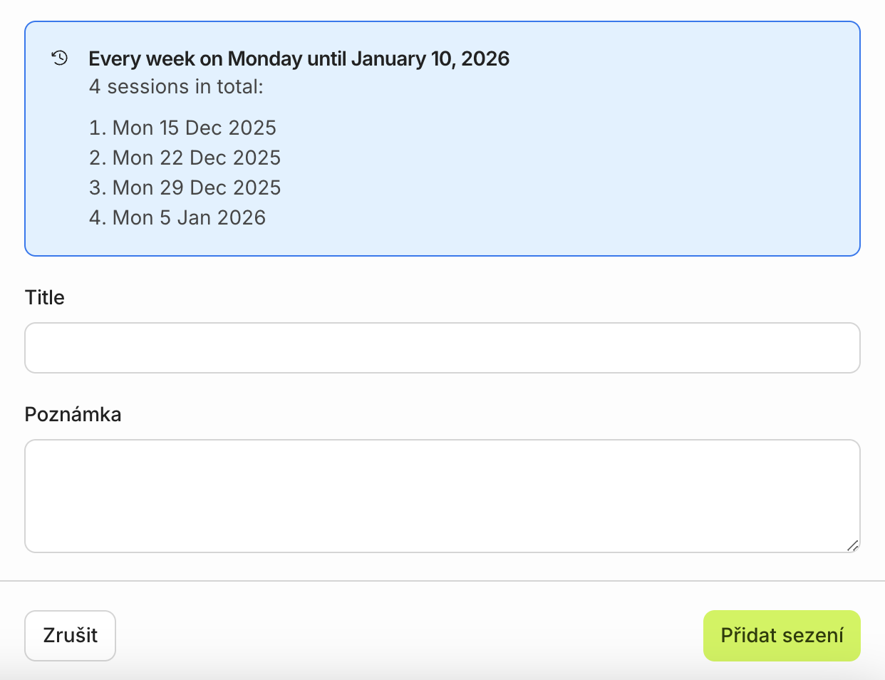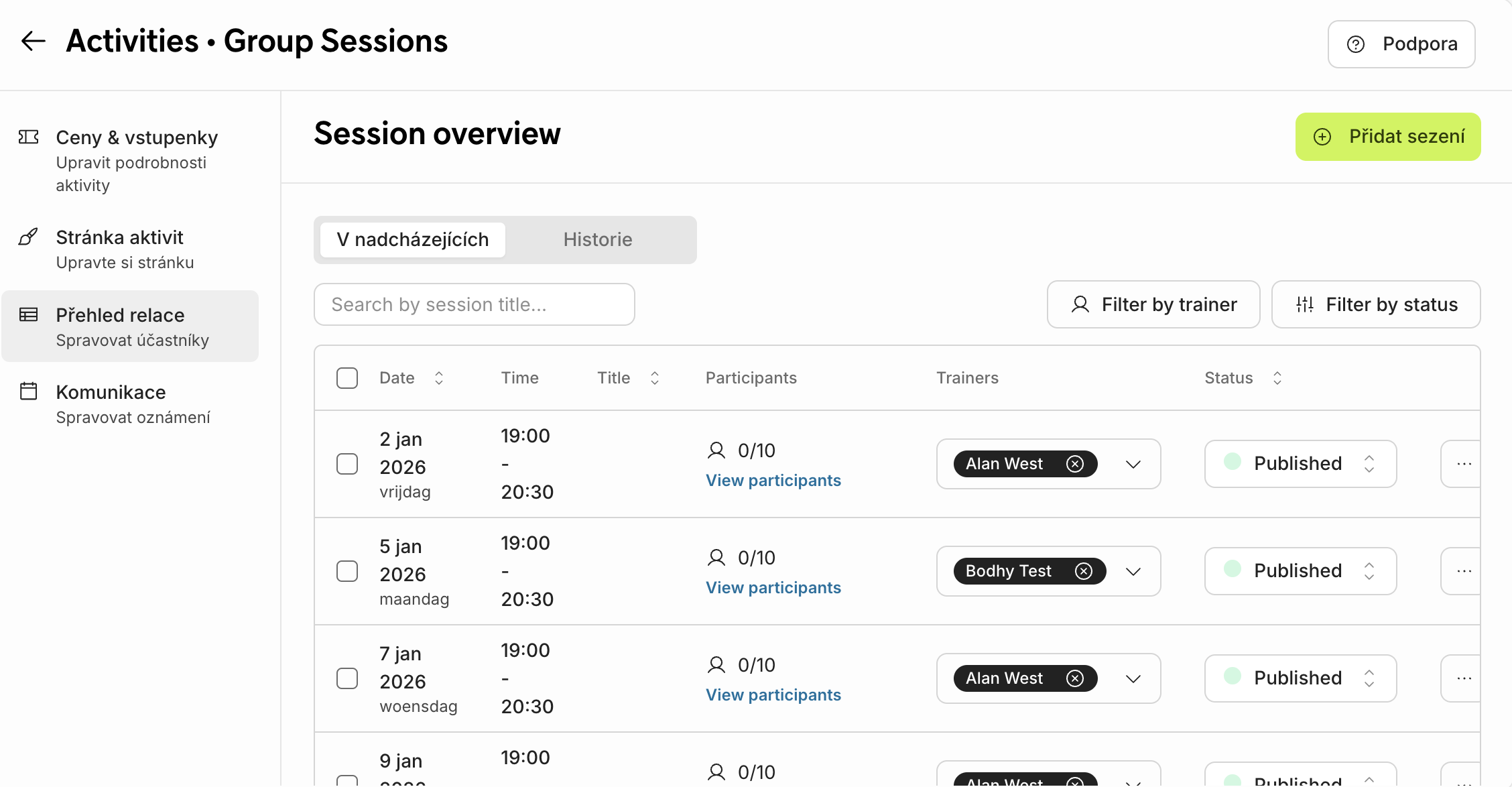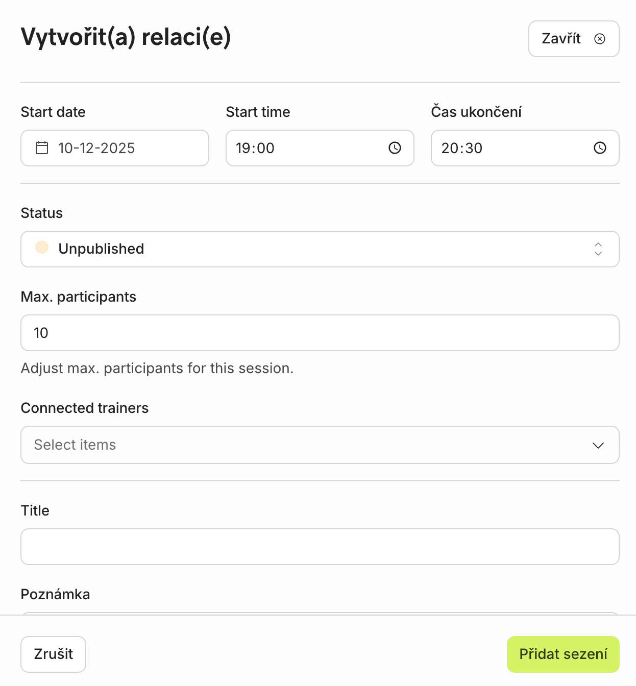 2. Vyplňte všechna povinná pole, např. datum zahájení, čas, počet účastníků apod., a uložte informace kliknutím na Přidat session. Po dokončení bude session viditelná pro klienty na marketplace.