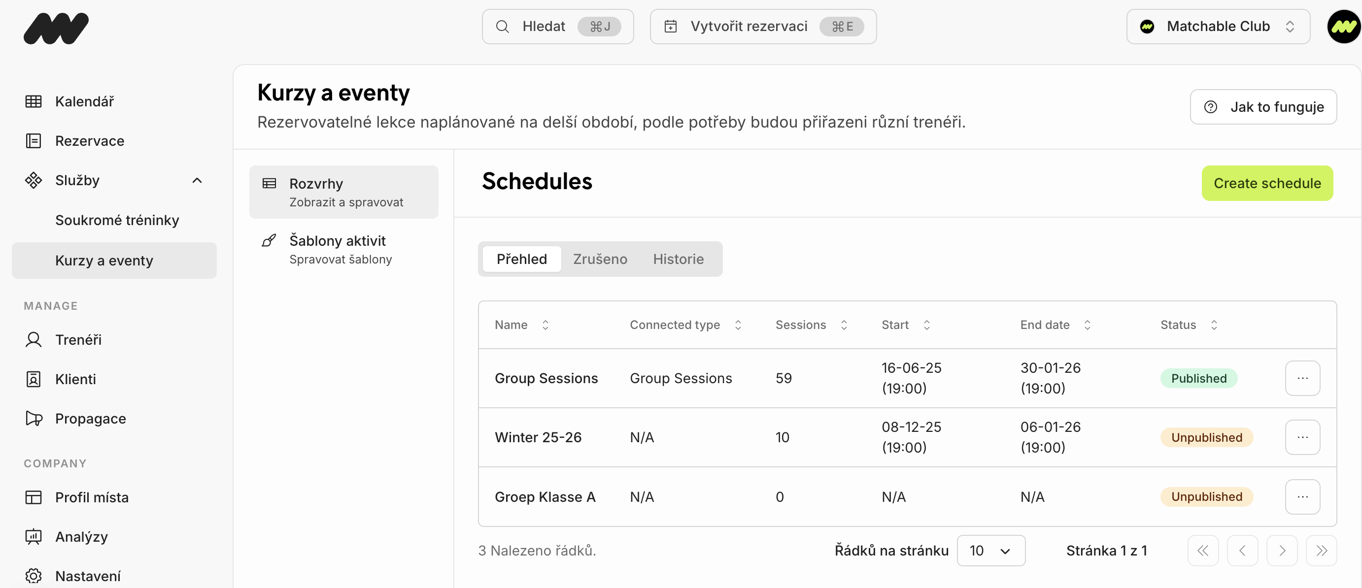 Pro speciální příležitosti, jednorázové akce nebo prodej vstupenek se události vytvářejí v Matchable Manageru.