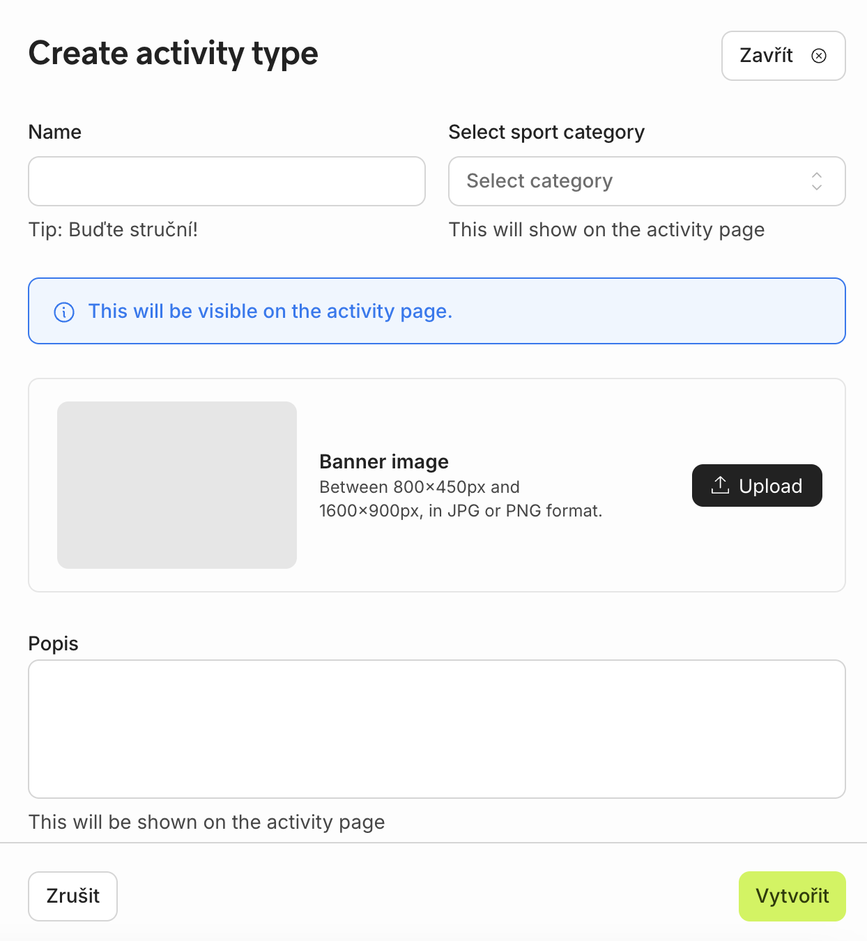 2. Vyplňte Název události, vyberte sportovní kategorii (např. padel), nahrajte pěkný bannerový obrázek a přidejte Popis události, aby lidé věděli, o co jde. Kliknutím na zelené tlačítko Vytvořit událost uložíte.