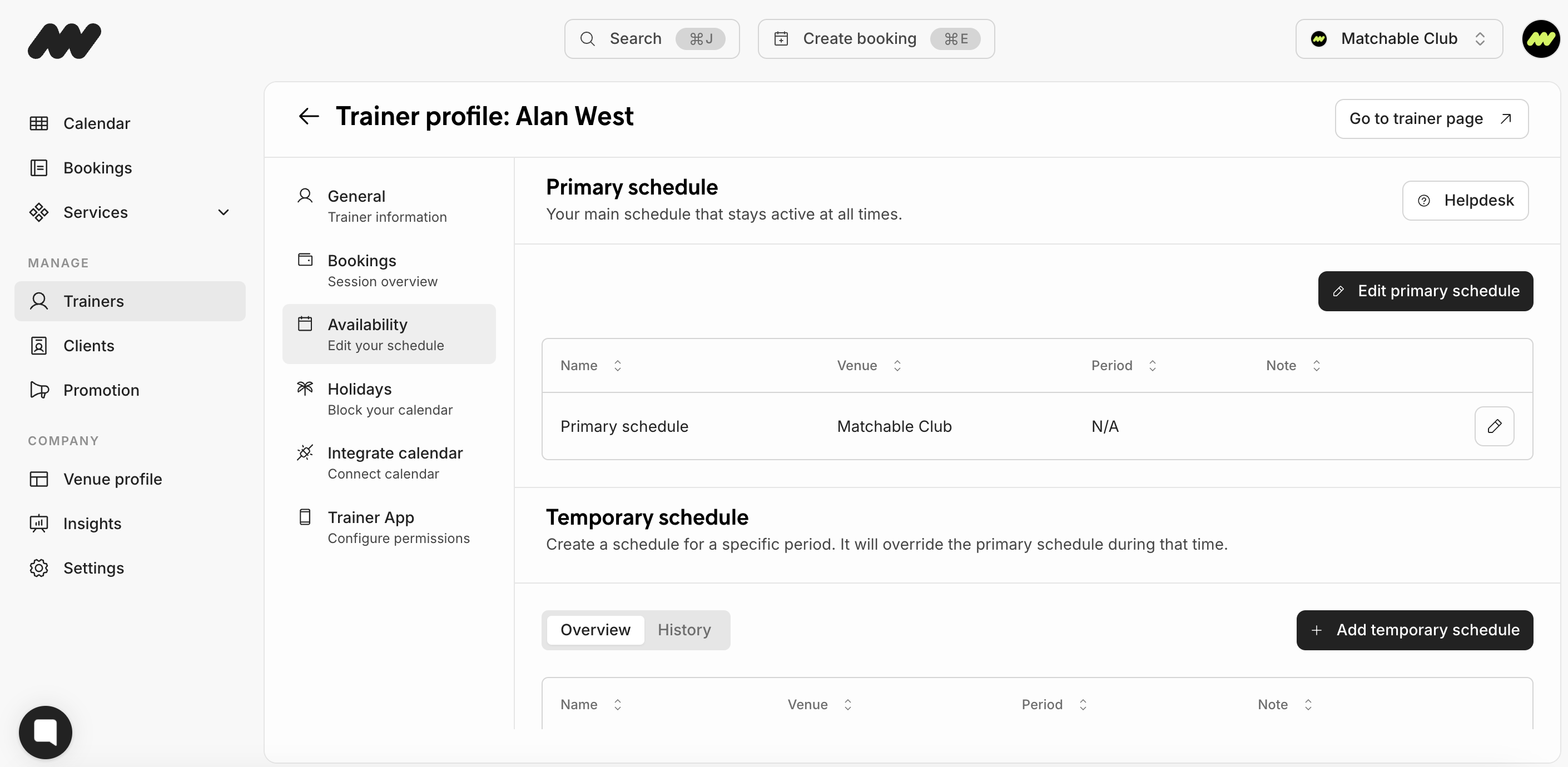 You can update your profile, availability, and schedule directly in Matchable Manager or trainer application. Go to Trainers> Availability and add your schedule. Read this article for more information.