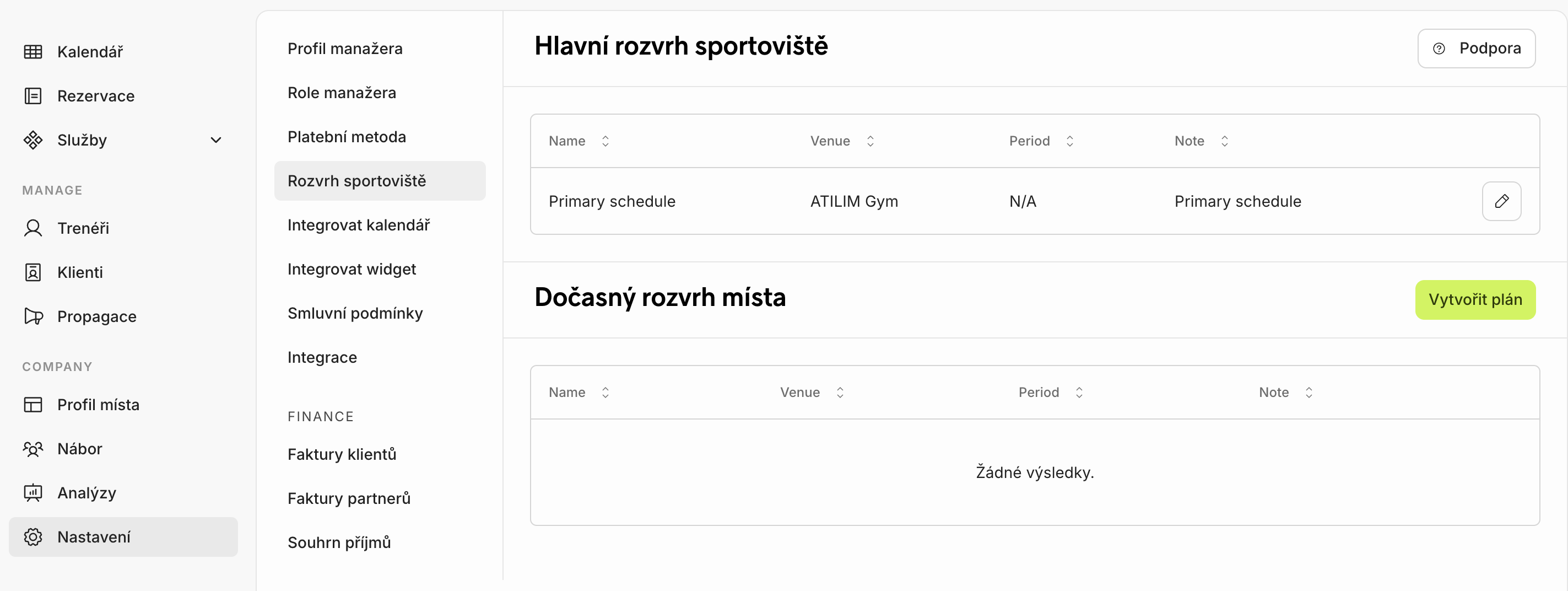 Přejděte do záložky Nastavení v levém dolním rohu a vyberte Rozvrh sportoviště.