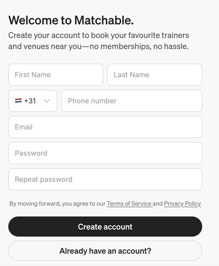 There is no sign-up or subscription fee. Matchable is 100% free for you to use as a customer, you only pay for the sessions you book. Every payment you make goes straight to the venue and/or trainer. There are no transaction fees or hidden costs. Promised.